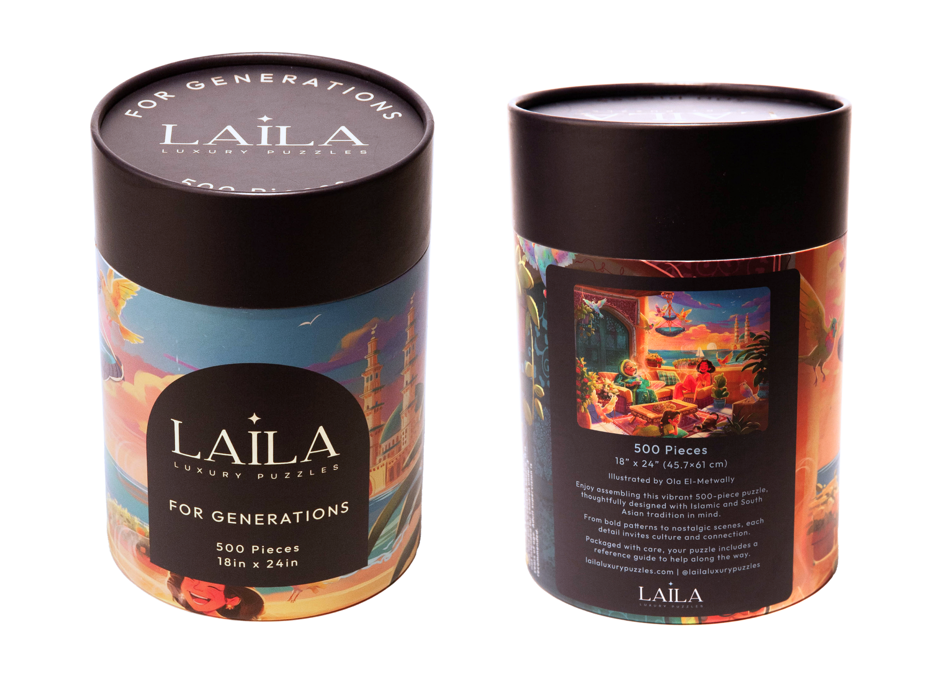 Enjoy assembling this vibrant 500-piece puzzle, thoughtfully designed with Islamic and South Asian tradition in mind. From bold patterns to nostalgic scenes, each detail invites culture and connection. While completing the puzzle, you'll find generations of women bonding over tea and sweet treats on a beautiful terrace overlooking the sunset.